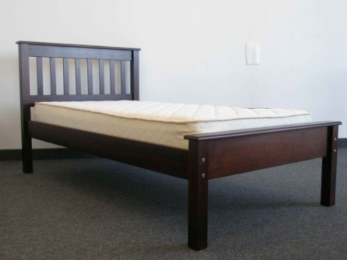 Description : Solid Wood Cappuccino Finish Brazilian Pine Twin Bed - Finish is child-safe - All wood is fully sanded and protected with a clean smooth coating to prevent cracks and splinters - Solid Brazilian Pine - no particle board - Twin bed includes (2) Side Rails (1) Head Board (1) Foot Board (12) Wood Slats - Total Dimensions are approx. 40 high x 80 1/2 long x 43 inches deep - space between floor and bottom rail is 11 1/2 inches - Requires a standard twin mattress (39 x 75 inches) - Hardware and instructions included - some assembly required - SALE IS FOR TWIN BED ONLY EXCLUDES MATTRESS, PILLOWS AND BED COVERINGS.