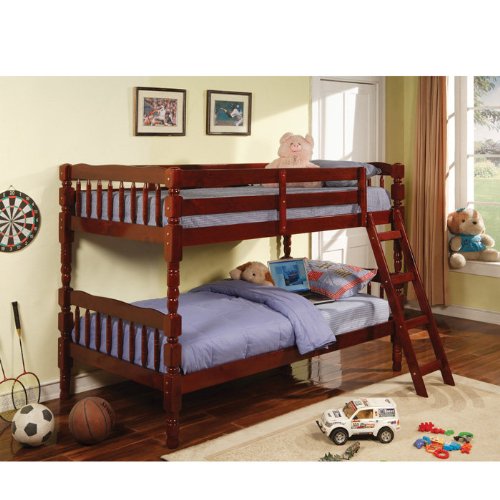 Description : With charming casual style, this twin bunk bed is a perfect space saving solution for your child's bedroom. Turned detail and subtle curves contribute to warm and relaxed designs, while the built-in guard rail and ladder add to safety and convenience. Available in either a medium pine finish or rich cherry finish to accommodate personal style. Features: Durable wood construction Rich Cherry finish Twin over Twin size Built-in guard rail and ladder Traditional styleSpecifications: Overall Dimensions: 61.38" H x 42.75" W x 80.25" D Weight: 118 lbs