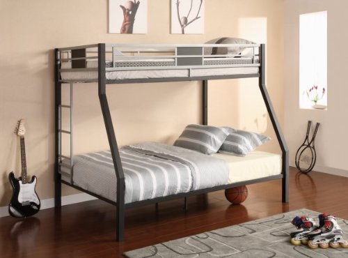Description : Designed to maximize space, this twin-over-full bunk bed offers plenty of sleeping space. It's perfect for siblings, sleepovers and storytime. DHP Silver Screen Twin-Over-Full Bunk Bed, Silver BY Dorel Home Products DHP's Silver Screen Twin-Over-Full Bunk Bed brings a cool, chic look with practical use to any bedroom. Looking sharp and sleek, the clean silver metal frame is durable, stable and long-lasting. This bunk bed suits any decor with its contemporary design. The top bunk is reached with an easy-to-climb ladder that is conveniently placed at the foot of the bed so as not to infringe on the lower bunk. Fitting any twin-size mattress, this bunk bed is an ideal choice for any smaller room.