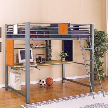 Description : The ultimate in durability, functionality, and just plain cool design. A complete youth bedroom in the space of a full size bed. This versatile loft bunk includes a full size upper bunk and a study desk unit underneath. Desk is set up to handle computers or video games with pull-out keyboard tray, hanging shelves and cd racks. Made from industrial strength powder coated square tube, barstock and sheet steel in a silver finish with inset laminated top panel. An upbeat, cool look that's not just for school anymore. Bunk includes changeable Navy, Powder Blue, White and 2 Orange small panels. Desk includes changeable Navy, Powder Blue and Orange large panels. Uses standard full size mattress. Some assembly required