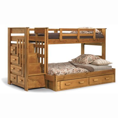 Description : For classic style quality craftsmanship and smart space-saving design the Heartland Twin over Full Bunk Bed with Stairs is an excellent choice. The top bunk features safety rails on all sides for increased safety and it's accessed via a set of sturdy stairs. These wide steps are easier and safer for small children than a traditional ladder. As an added benefit each step has a built-in drawer perfect for clothing toys and more. You also have the option of adding space-saving storage drawers underneath the bottom bed. This bunk bed is a unique and smart choice for a multi-child room that's a little short on space. You get so much more than beds.Crafted of solid pine this bunk bed has a natural rustic look to it. The golden finish does a wonde...
