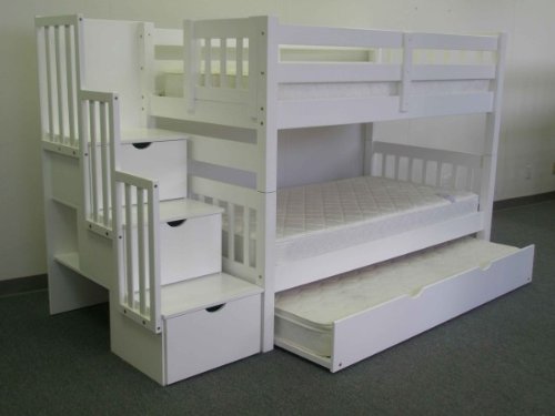 Description : Solid Wood White Finish Stairway Twin over Twin Brazilian Pine Bunk Beds with Twin Trundle - Twin Trundle provides additional twin bed - so 3 beds in all - 3 drawers built into Stairway for added storage - This bunk bed model has been tested by an independent laboratory - Finish is child-safe and lead free - All wood is fully sanded and protected with a clean smooth coating to prevent cracks and splinters - Solid Brazilian Pine - no particle board - Total Dimensions are approx 62 high x 102 wide x 42 inches deep - Bottom bunk is approx 11 inches off the floor - space between bottom bunk slats and top bunk slats (excluding the mattress) is approx 29 inches - Internal measurements of the Drawers are approx 17 3/4 wide x 15 deep x 10 inches hi...