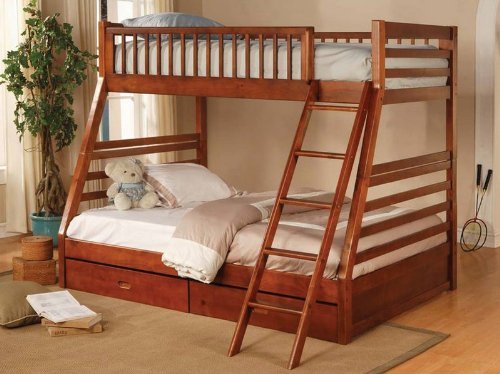 Description : Jackson Twin/Full Bunk Bed (model 460183) by Coaster features a twin over full bunk bed design with two storage drawers under the full bed (bottom bunk). This casual style bunk bed comes in a rich walnut finish with rake details that will complement a guest bedroom or kids bedroom. This kid's bunk bed can sleep up to three people and with the extra drawer space, storage and organization won't be a problem. NoPart: 460183