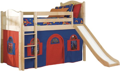 Description : Childrens Lofted Twin in Natural finish with Slide and Bottom Curtain in Blue/Red