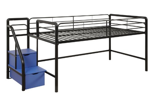 Description : DHP's Junior Loft with Storage Steps - Black with Blue Steps is a great fit for any kids room. Your child will love staying underneath the loft and hiding their toys inside the steps only to find them again the very next day. This will keep their rooms nice and tidy. Climbing up and down the steps is another amusing feature with this bed. With an affordable price, high quality and sturdy construction and the guardrail for security, you can't go wrong with the Junior Loft with Storage Steps. Made for use without a box spring, this bed accommodates any twin size mattress of your choosing.
